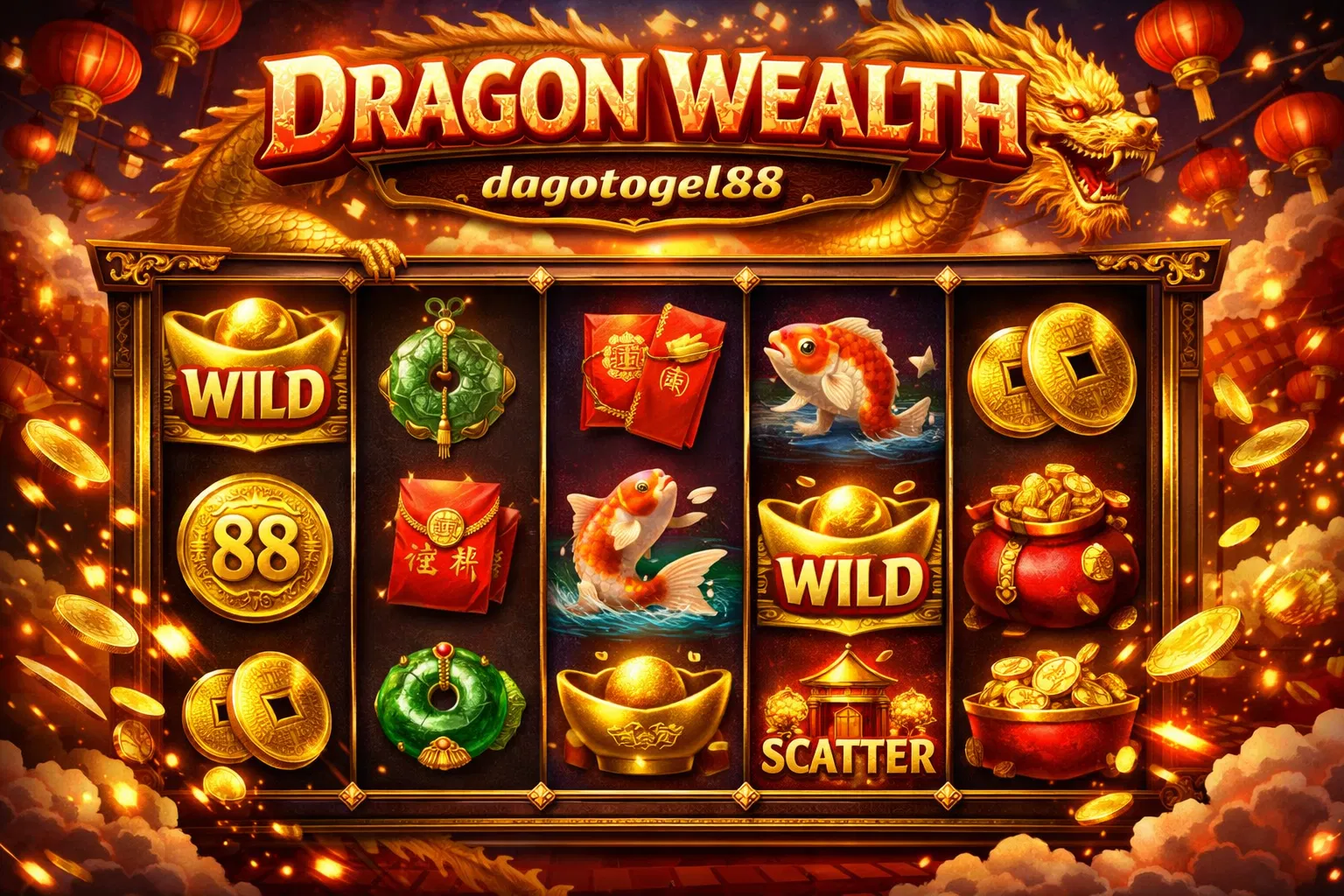 - Tema Budaya Asia yang kental dengan simbol keberuntungan dan naga emas.